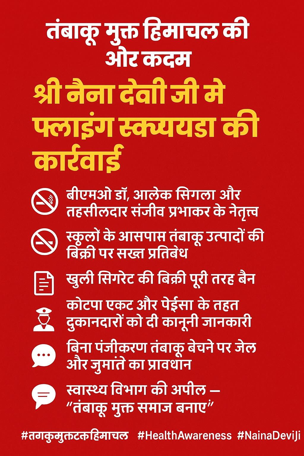 श्री नैना देवी जी में फ्लाइंग स्क्वायड की कार्रवाई — तंबाकू उत्पादों की बिक्री पर कड़ी निगरानी